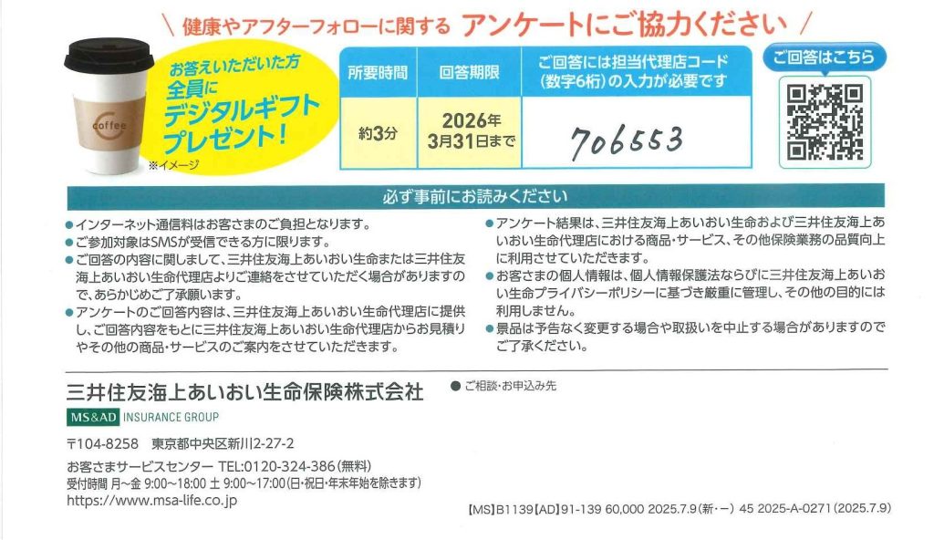 アンケートはチラシに記載のQRコードからご回答ください。 (代理店コード「706553」のご入力お願いいたします。)